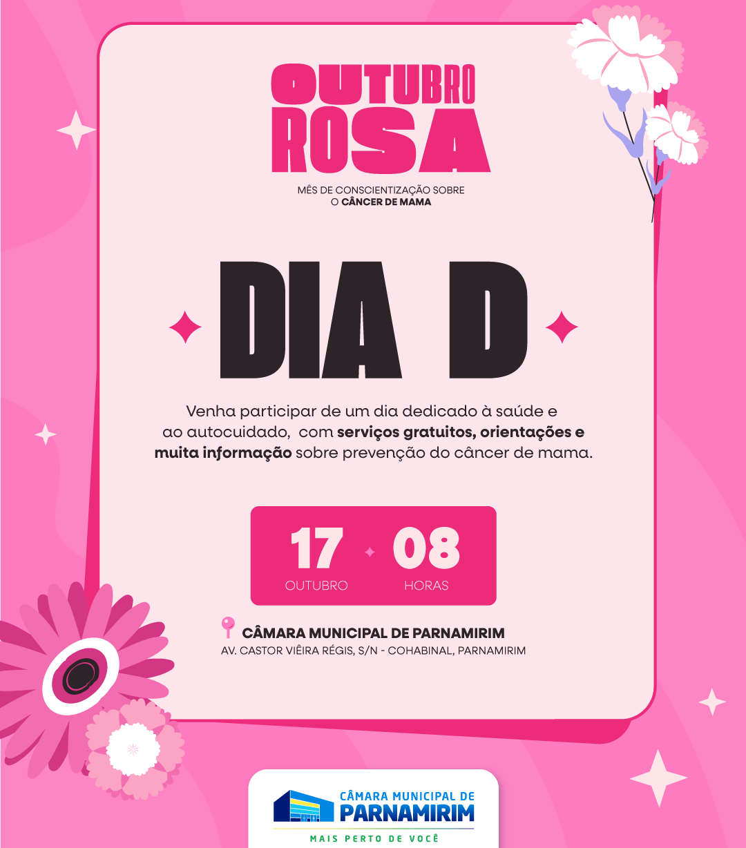 Em alusão ao Outubro Rosa, mês dedicado à conscientização sobre a prevenção e o diagnóstico precoce do câncer de mama, a Câmara Municipal de Parnamirim realizará, nesta sexta-feira (17), das 8h às 13h, um evento voltado aos servidores da Casa Legislativa e à população em geral. A programação contará com atendimentos especializados, palestras educativas e serviços de beleza e bem-estar.